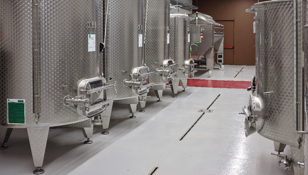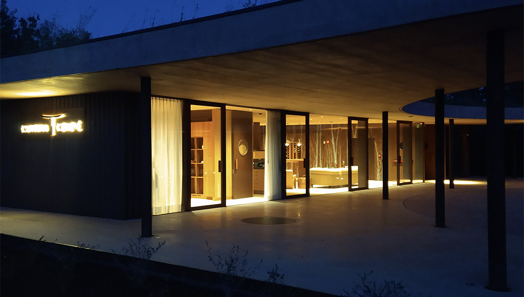 È un progetto che si fonda su valori di rispetto della terra, del paesaggio e delle persone che vi lavorano. Un edificio, progettato dal giovane architetto milanese Pietro Pizzi, che si caratterizza per le sue linee geometriche armoniche che seguono l’andamento e la morfologia del terreno e dei vigneti. I materiali come il cemento rosso, i mattoni e il Cor-Ten, stabiliscono un dialogo con il territorio.